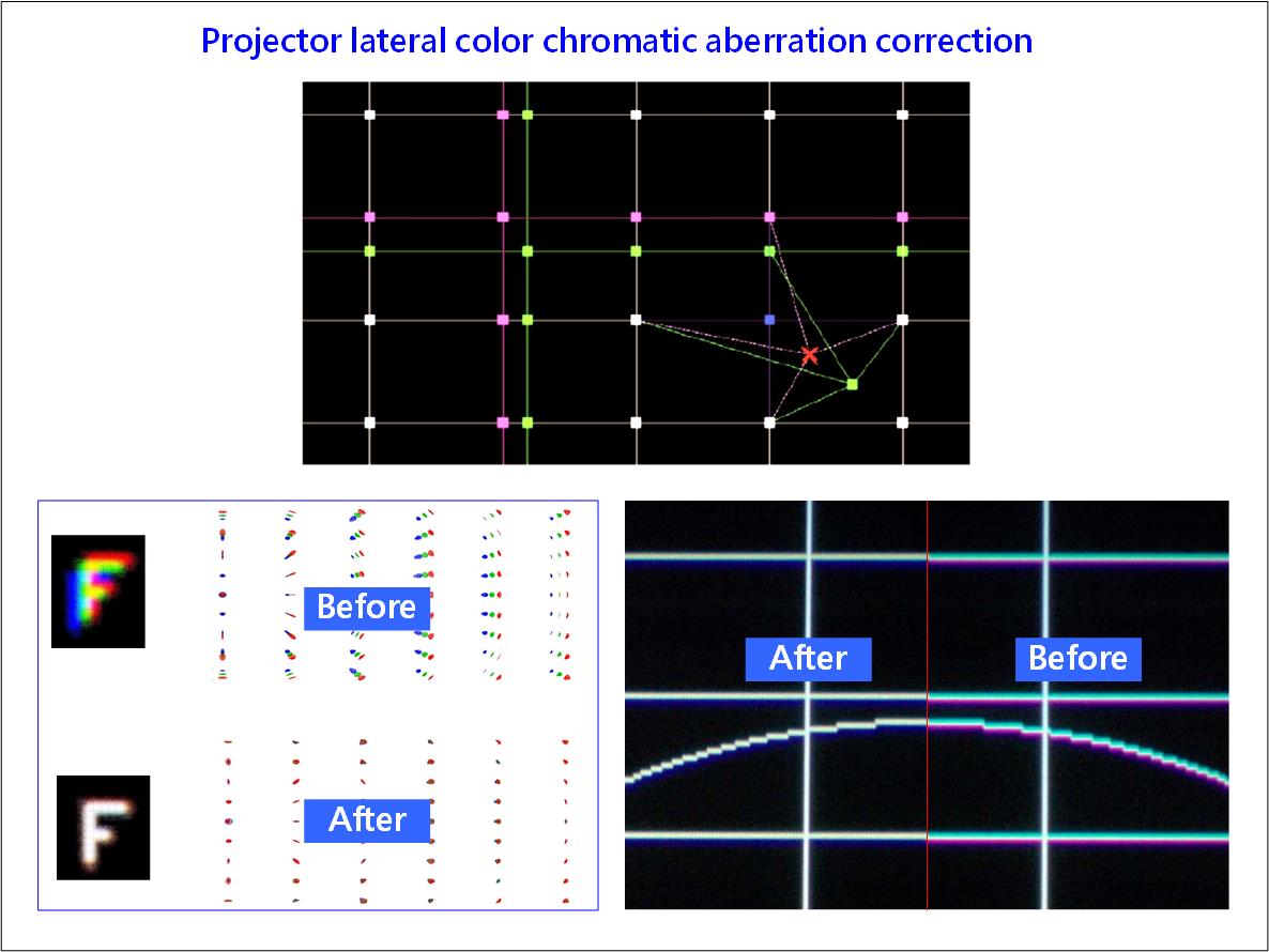 - 横色収差(ラテラルカラー)の修正方法:チャネルごとの色調整、10ビット処理、モーション適応型デインタレース、細かいグリッドのジオメトリツールを使い、RGBを1/4ピクセル精度で合わせます。