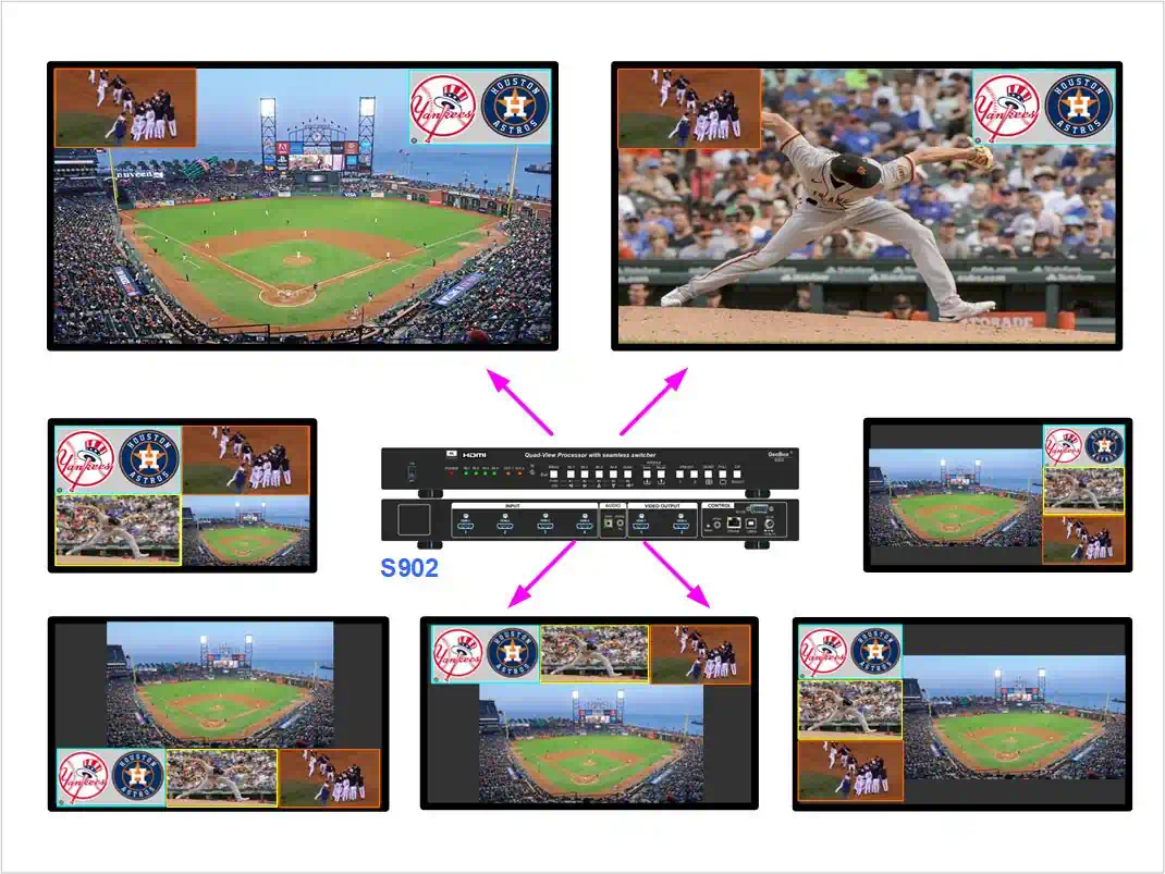 The S902 is a UHD quad video processor that lets you show up to four 4K/60 sources at the same time on one or two UHD displays. This quad video processor gives you flexible screen control for multi-window viewing, making it easy to manage several video feeds on a single screen or across two displays.